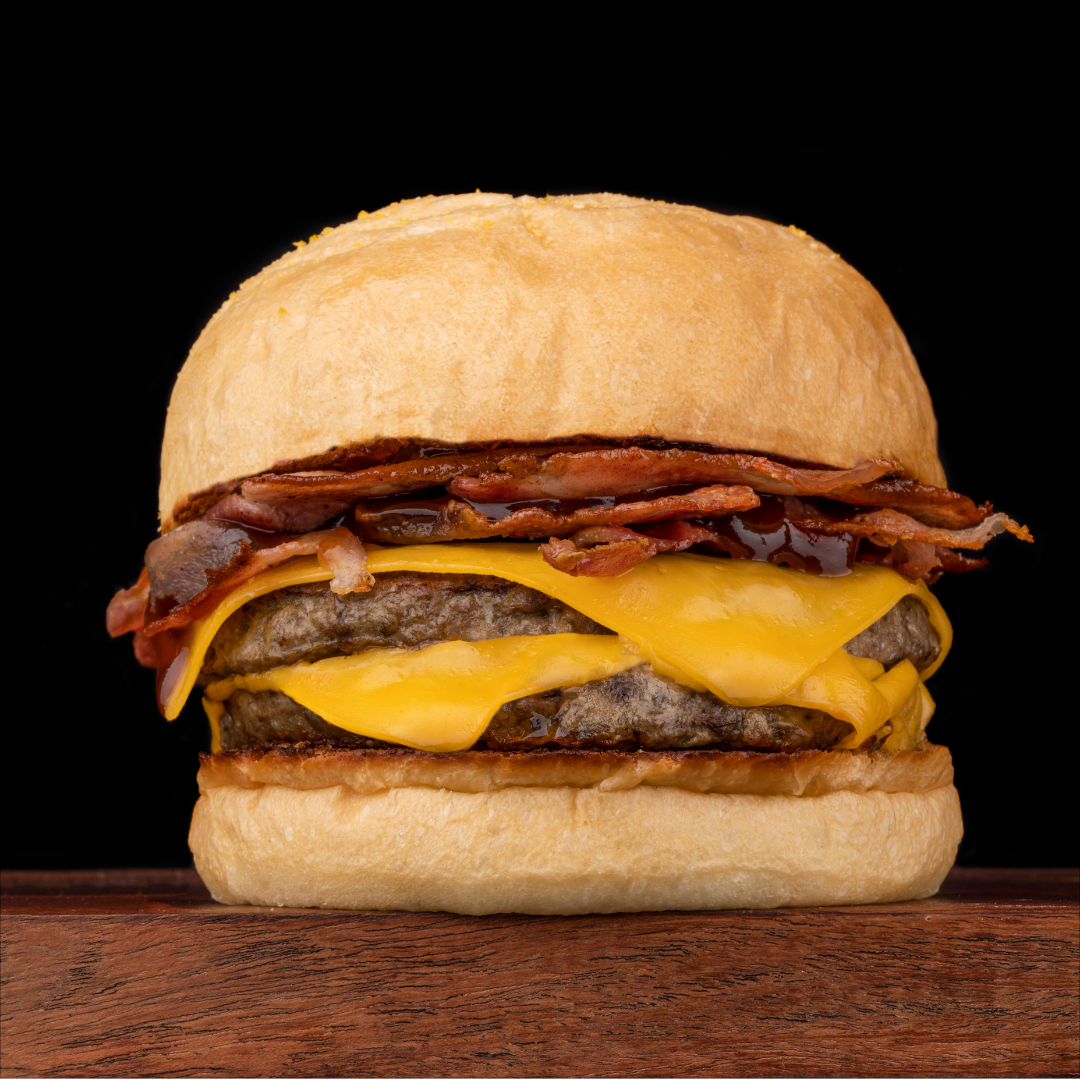 Duas carnes smash, cheddar, picles e maionese.